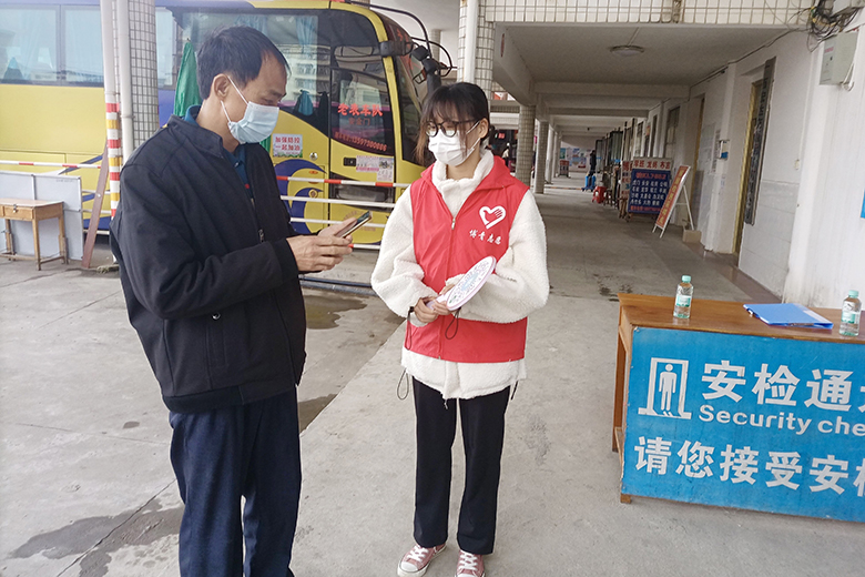 寒假期间,环境科学与工程学院2020级给排水科学与工程专业刘惠华同学成为一名志愿者,投身到家乡玉林市博白县的疫情防控志愿服务中。在这期间,她主要是在家乡车站的出站口引导旅客出站、测量体温、引导旅客出示健康码、提醒他们佩戴好口罩等。刘惠华同学提到:“车站人流量大时工作会很辛苦,有时遇到年迈的旅客不会使用智能手机扫健康码,还需要帮助他们进行纸质登记。面对不会说普通话的旅客则要灵活面对并且耐心细心与之沟通交流。遇到问题时志愿者们齐心协力、互帮互助,一起解决问题。”在本次社会实践中,刘惠华同学跟其他志愿者小伙伴们沟通、合作,一起做好跟出站的旅客们的沟通工作,尽力帮旅客解决困难,配合疫情防控,在疫情防控服务中奉献自己。