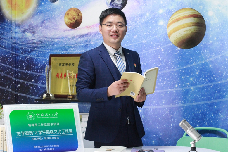 坚持网络育人,坚守新阵地。为学习贯彻落实习近平总书记在全国高校思想政治工作会议上的讲话精神,运用新媒体新技术使工作活起来,增强时代感和吸引力,他申报、主持学校辅导员工作室“地学微风”大学生网络文化工作室,积极筑牢网络育人新阵地,先后有广西高校学(研)工部部长培训班成员以及广西财经学院、广西工商职业技术学院等高校的多批次考察团到学院参观考察。眼里有光,心中有爱,他是网络育人耕耘者。作为一名辅导员,他牢固树立“四个意识”,深入学生当中,用“网言网语”引导同学们树牢“四个意识”、坚定“四个自信”、做到“两个维护”。他善于抓住重要节点和重大事件,积极开展思政教育。在庆祝建国70周年之际,发表《我和我的祖国》一文与青年对话;在疫情防控期间,通过《雷锋月里,写给同学们的一封信》,赞扬青年学子无私奉献,坚定必胜信心等,他的多篇原创网文得到高校思政网、高校辅导员联盟等平台的多次转载,辐射广泛。他积极创作形式多元的网络文化作品,围绕学生、关照学生、服务学生。创作歌曲桂工版《南山南》获得300多万次播放;疫情防控期间的《院长下午茶》《1.1亿的实验室探秘之旅》等直播节目得到了数万人次在线观看;在2020年招生期间,代表学校参加了18场招生宣传直播;为献礼建党百年,积极创作主题微党课《断肠明志铸忠魂》,宣讲陈树湘烈士的英勇事迹,在区内外平台进行展播。相互转化,持续发展,他是网络育人排头兵。在网络育人的实践探索中,他及时凝练成果,先后完成了3篇相关学术论文,主持了4项相关课题,带领学生进行相关大创立项11项,培养出了一批优秀的新媒体学生干部。他积极与专业老师沟通合作,参与慕课建设,参加“我心中的思政课”全国高校大学生微电影展示活动、广西高校微课比赛等。
