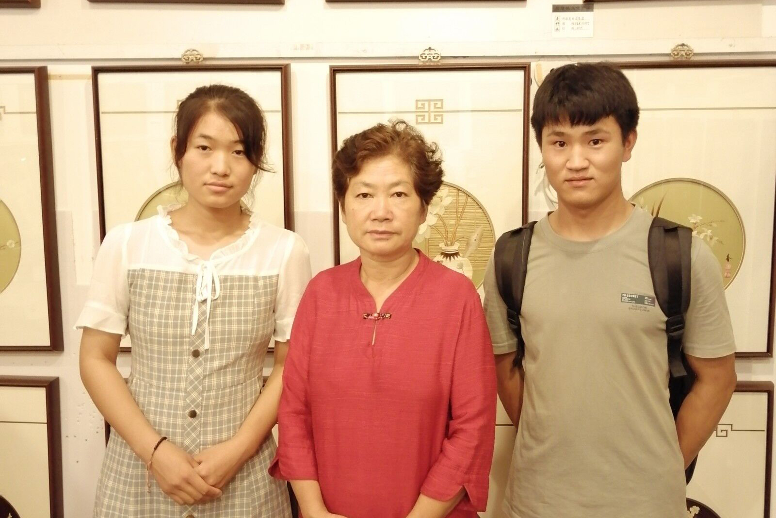 杨威鹏同学(右一)及团队成员与传统民间艺术麦秆画传承人刘利英老师合影