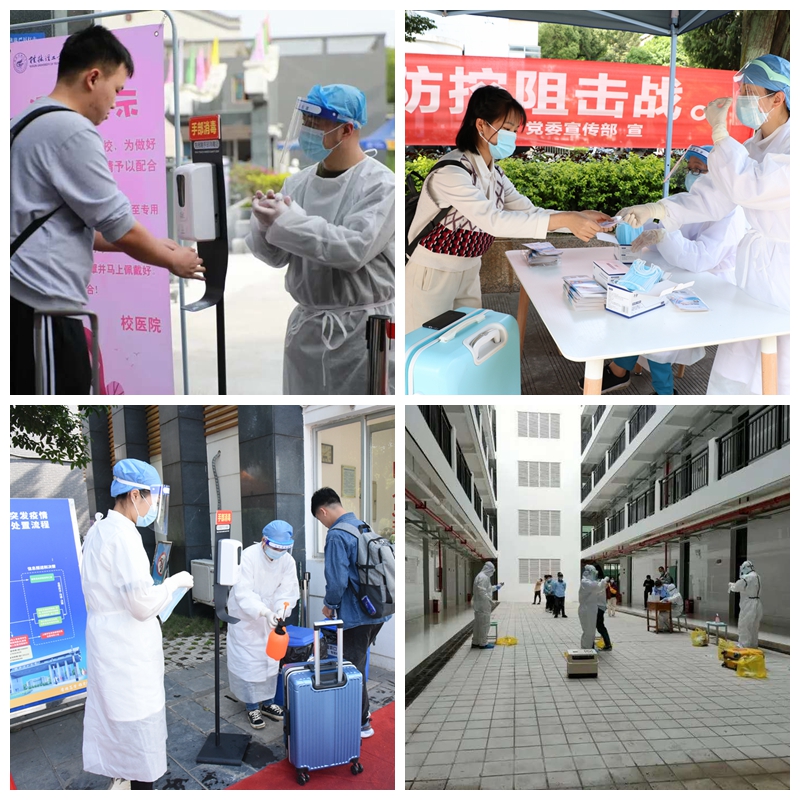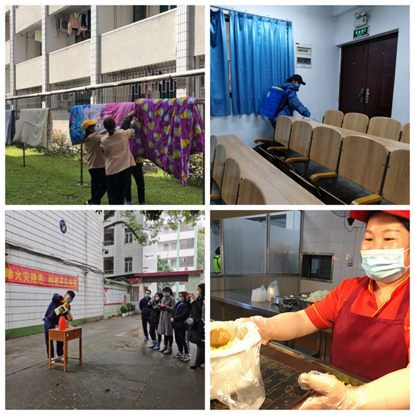 “非常时期,服务更要跟得上”,后勤服务集团全体职工疫情期间坚守岗位,严格落实疫情防控相关措施,做到“守土有责、守土担责、守土尽责”,为学校顺利开学提供坚强有力的后勤保障,为返校师生提供更加亲切的服务。饮食服务中心、公寓服务中心、物业管理中心、采购配送中心、校车队等各部门全力以赴做好疫情防控和开学各项准备工作,及时采购设备、配备人员全面开展疫情防控工作;不留死角、全覆盖开展消杀工作,组织校属各部门进行了消毒操作演示和培训,确保校园环境安全卫生;严格监测人员健康状况,加强疫情防控知识宣教培训;采购储备防疫物资、生活物资,为开学准备工作打下夯实的物资基础;对校内的水、电等设施进行全面检查、及时维修,以保障师生开学正常使用水、电等设备;每日至少两次彻底清洁和消毒校车,严格驾驶员健康要求和教职工乘车规定;提前晾晒学生棉被,精心养护校内花草、树木,为师生打造良好的校园生活环境。