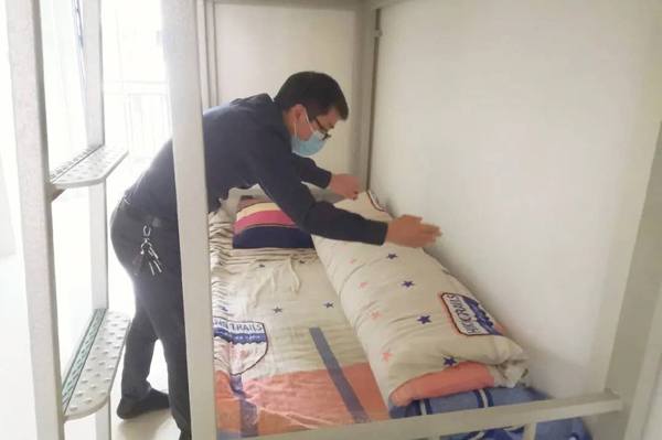 地学院辅导员为学生铺床