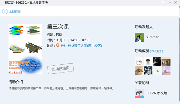 除了自己主讲的课程,陈余道教授还积极为团队开设的其他课程出谋划策。他建议团队在准备线上教学时,要充分了解课程的特点,既要把现有的教学资源使用好,又要考虑到学生的地域时间差异、网络条件等实际情况,制定有针对性的网络教学方案。例如《水文地质学基础》课程,就借助中国大学MOOC平台已有的慕课资源,再利用QQ群进行知识点串讲、突出章节内容的重点、难点。再如《水文地质数值法》课程,由于实践操作性较强,就采用腾讯课堂直播授课,辅以网教平台接收学生的反馈。另一方面,团队以课程组为单位,积极进行在线课程的集体备课,共享教学资源。