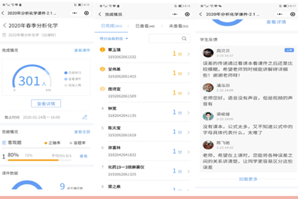 高效的课堂,需要充分发挥教师的主导作用和学生的主体作用。分析化学课程教学团队采用多师协作授课的方式开展线上教学,改变以往“单师授课”的课堂教学模式,有利于教师掌控课程,稳定学生情绪。当前,线上教学面临的最大挑战不是师生,而是网络卡顿。虽然在开课前教师进行过多次测试,制定了多套预案,但在开课之初登陆平台难、直播卡顿、突发瘫痪等问题仍然接连爆发。学生很容易因此出现负面情绪,消极对待课程。为此,课程教学团队的教师们拧成一股绳,守初心,担使命,及时疏导学生不良情绪,给予学生更多的情感关怀。同时,在线直播中,主播教师与其他教师间相互配合,保证学生的参与度。无论哪位老师做主播,其他老师都会选用“学生视角”,时刻“监听”着网络音质是否稳定,并随时关注着同学们在微信群里提出的问题,做到全面掌控、时刻把握、及时回应。在云端课堂里,老师们及时与学生交流互动,使得各专业同学之间思想激烈碰撞,同学们学习主动性被充分调动起来,同学之间也结下深厚的友谊。