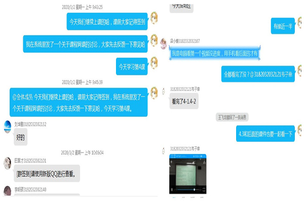 张老师的第一周的上课方式主要是利用QQ群来实时发送消息,回答学生疑问,进行课前签到点名;学生进入桂工慕课观看授课录像,有问题及时在QQ群反馈,录像看完后,老师发布课后作业,集中答疑等内容。作业提交和批改都限时完成,以督促学生及时巩固复习。