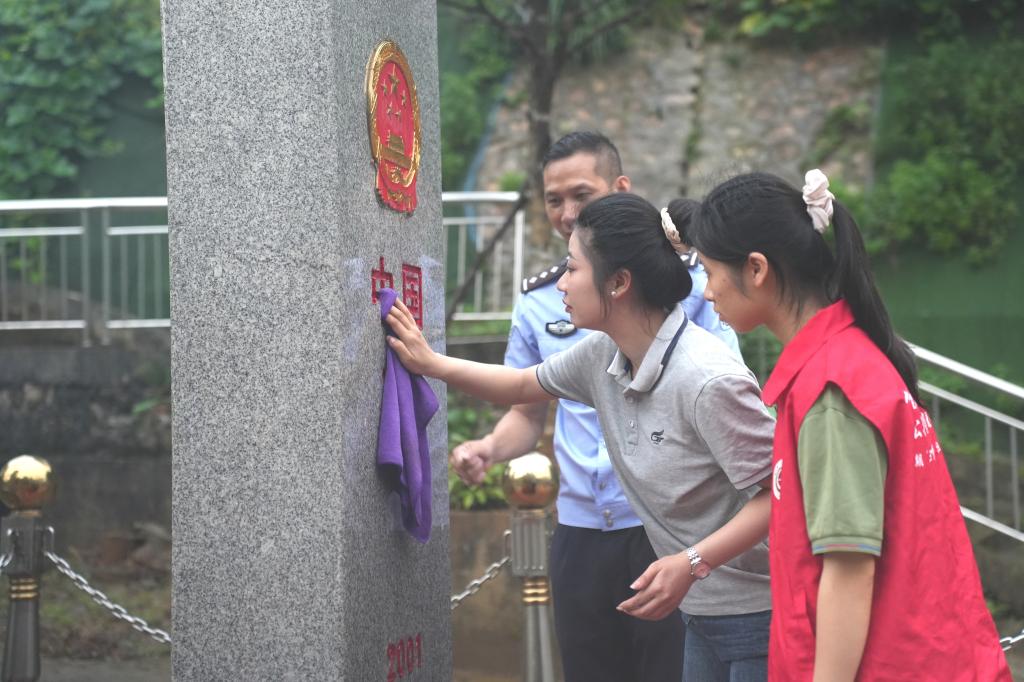 实践团成员在峒中口岸擦拭界碑