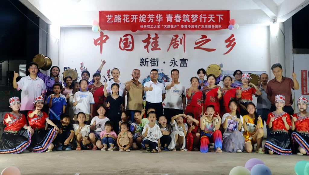 2025年暑假的灌阳夏夜,晚风裹挟着稻花香,广西桂林灌阳县新街镇永富村的晒谷场上灯火通明。beat365官方网站“艺路花开”美育浸润推广志愿服务团队与村民们共同演绎的文艺汇演,让这个“中国桂剧之乡”的小乡村沸腾了。掌声与欢笑交织间,一场持续两天的美育浸润实践,结出了最甜美的果实。