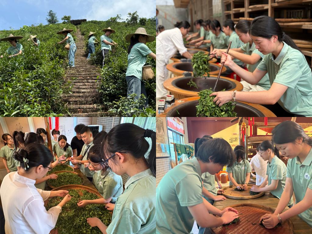 在灌阳县顺溪村,队员们深入了解油茶品牌推广与茶厂建设发展中存在的问题;在昭平县茶园,他们参与采茶、杀青、揉捻等全流程学习制茶工艺;在六堡镇,他们拜访非遗传承人探索六堡茶“三黑”特色工艺的奥秘。这不仅是一场以茶为媒的社会实践,更是一段扎根乡野、服务绿色发展的非遗探索之旅。团队深入非遗车间学习传统制茶技艺,系统调研茶产业生态种植、非遗工艺与市场推广路径,特别是产业绿色升级方向。