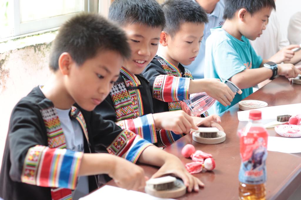 实践团紧扣“青春传承中华文脉工程”,在当地深入挖掘民族文化资源,开设剪纸、漆扇、拓印等传统技艺体验课程,让孩子们在动手操作中亲身感受非遗文化的博大精深。课堂上,孩子们用剪刀与画笔,描绘出属于自己心中的梦想,而在这一过程中,他们也逐步领悟到非遗技艺蕴含的深厚文化底蕴。这些体验课程不仅为孩子们打开了通往非遗世界的大门,更在他们心中播下了文化自信与认同的种子。活动走过了八步街道、黄洞瑶族乡、南乡镇等地,深入社区、学校与商圈等场所,共举办6场次,吸引超过600名孩子、居民和游客参与,广泛传播了非遗文化的独特魅力。