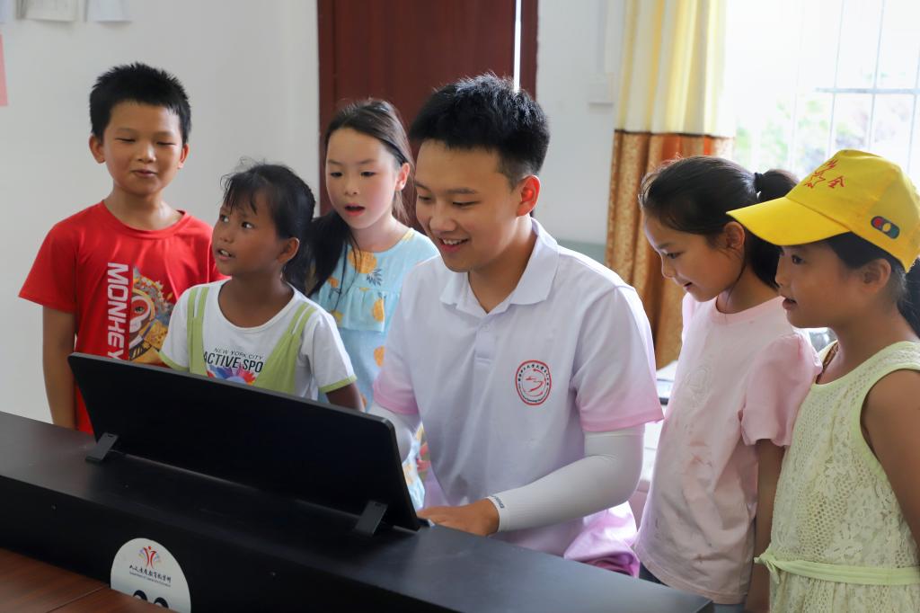 “艺路花开”实践团队成员正在教永富村小孩子们弹唱汇演曲目《虫儿飞》