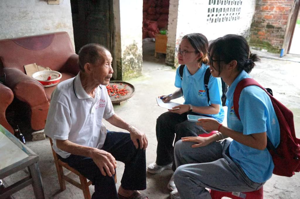 走进横山村,青石板路通向陈氏宗祠,斑驳匾额与遒劲楹联间流淌着百年清廉家风,“三元及第”的典故在梁柱间相传。实践团成员手持自制手册与调查表,随村干部走访,调研老人使用普通话的情况。晒谷场边老槐树下,队员们听老人讲红色往事,再用普通话逐句复述。曾担任村干部的陈爷爷感慨:“以前给外地游客讲红色故事,总怕人家听不懂土话,现在跟着娃娃们学普通话,咱村的英雄事能传得更远了!”