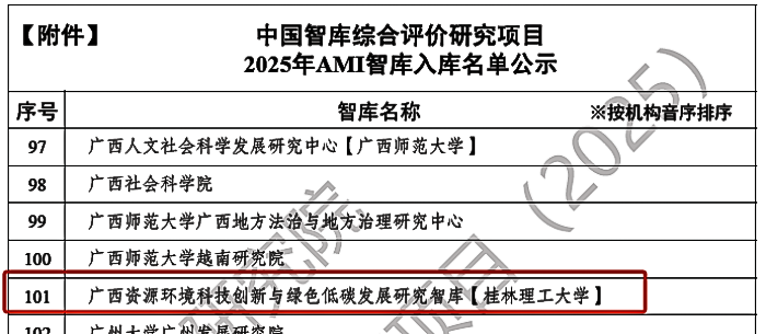 “广西资源环境科技创新与绿色低碳发展研究智库”入选“中国智库综合评价研究项目2025年AMI智库入库名单”