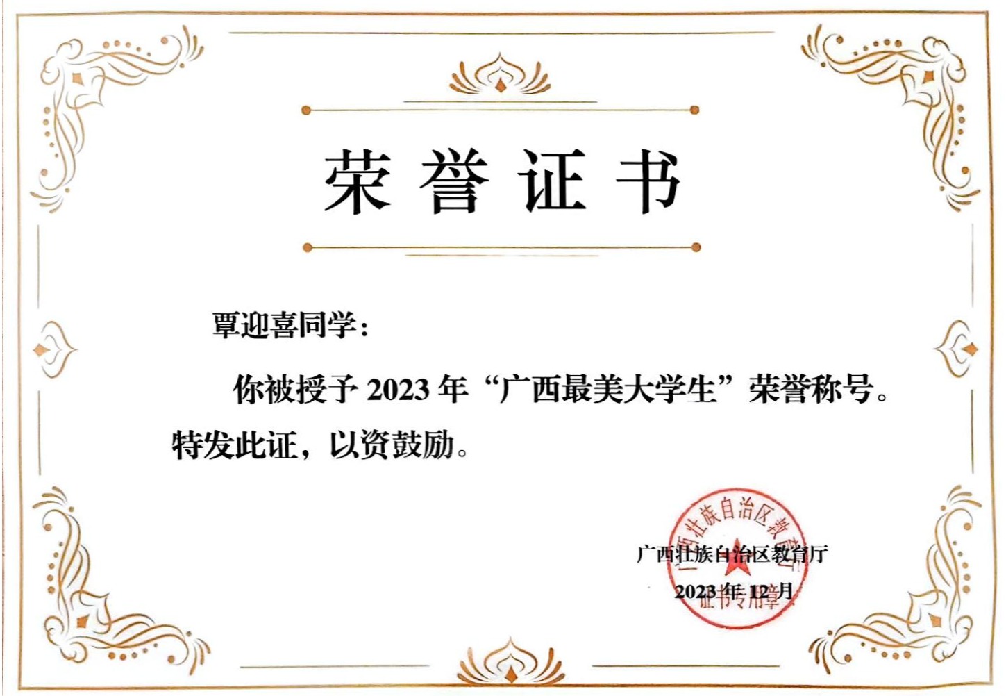 团队覃爱苗教授指导的研究生覃迎喜获评“广西最美大学生”