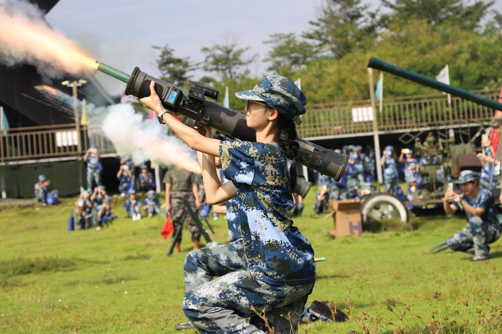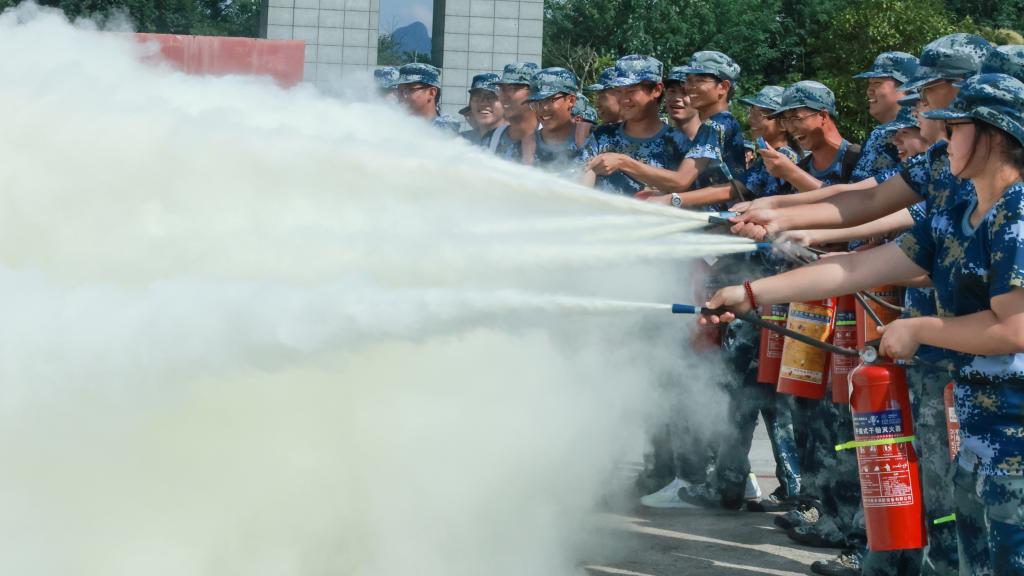 拉练队伍分批前往雁山消防救援大队和军博园,开展消防实战演练与国防教育基地参观。消防员现场讲解灭火器使用与火场逃生技巧,同学们踊跃参与模拟演练;军博园内,装甲车体验、模拟射击、战术对抗等项目,让大家近距离感受军事科技与国防文化的魅力。