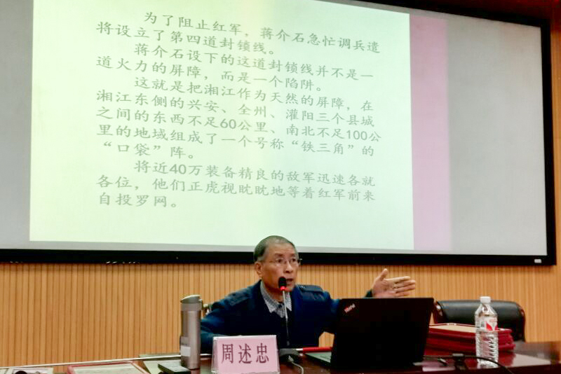 退休17年里,周述忠老师为“传承红色基因”干了11件“大事,即“五部讲座、三部展览、两部电视专题片、一座红色文物博物馆”。他结合青少年的身心特点,在“新”“活”“实”“联”上下功夫,开展革命传统教育;年过七旬仍亲自到博物馆、田野遗迹等地,以“红色旅游”导游员身份作实地讲解;他深入大、中、小学校开展《红军长征过桂林及其对实现中国梦的启示》《桂林英雄烈士的故事》《话说友善》等讲座70余场;举办《抗日战争时期的广西》《让历史告诉未来连环画展览》等三部展览;受邀录制《红军长征过桂林》和《桂林抗战英雄谱》两部专题片在桂林电视台播出;自筹经费利用市区住宅创办“恕忠博物馆”,免费向全社会开放。