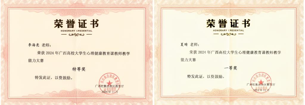 beat365教师在2024年广西高校大学生心理健康教育课教师教学能力大赛获特等奖1项、一等奖1项