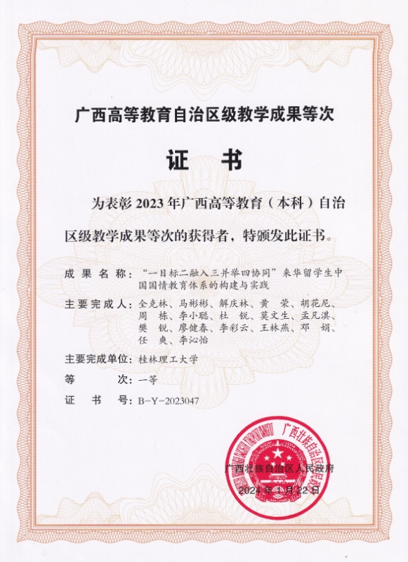 学校创新推动来华留学生国情教育体系建设,打造具有桂工特色的实践育人品牌。与桂林美术馆、靖江王陵国家考古遗址公园、全州才湾镇毛竹山村、灌阳县黄关镇商家村小学等单位共建10余个“来华留学生国情教育基地”,推动留学生深入了解中国国情与文化。2023年,相关教学成果荣获自治区教学成果一等奖,实现了广西来华留学教育领域在该奖项上零的突破。
