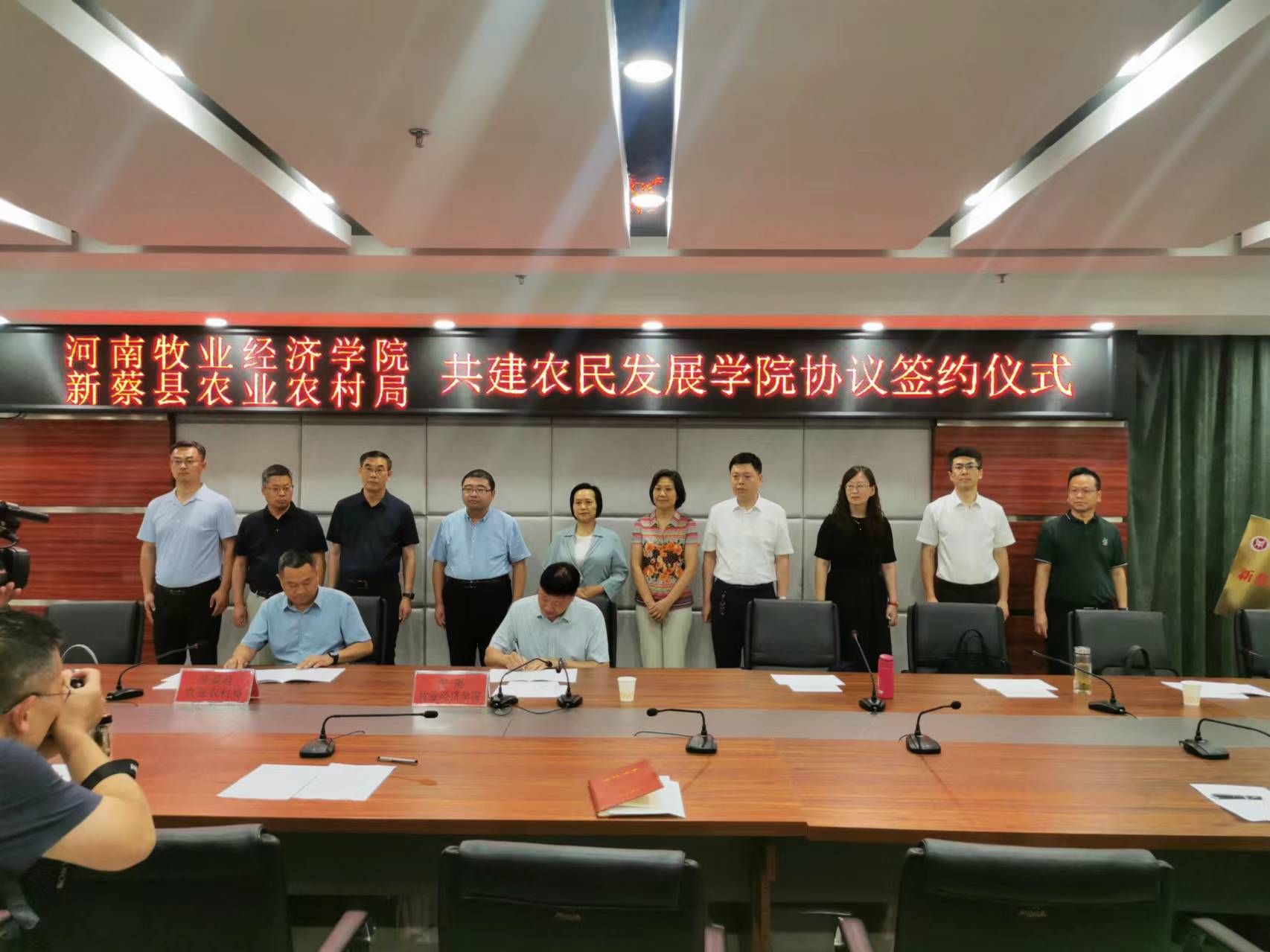 6月20日,校长尹新明、校党委副书记杨志清带队赴新蔡县开展校地结对帮扶工作,同新蔡县人民政府续签校地战略合作框架协议,尹校长和新蔡县副县长尹坤分别代表学校和新蔡县人民政府签订《战略合作框架协议》。koko体育官网院长宋平与新蔡县农业农村局局长李斌签订了《新蔡县农民发展学院协议书》,并向县农业农村局授予“新蔡县农民发展学院”牌匾。